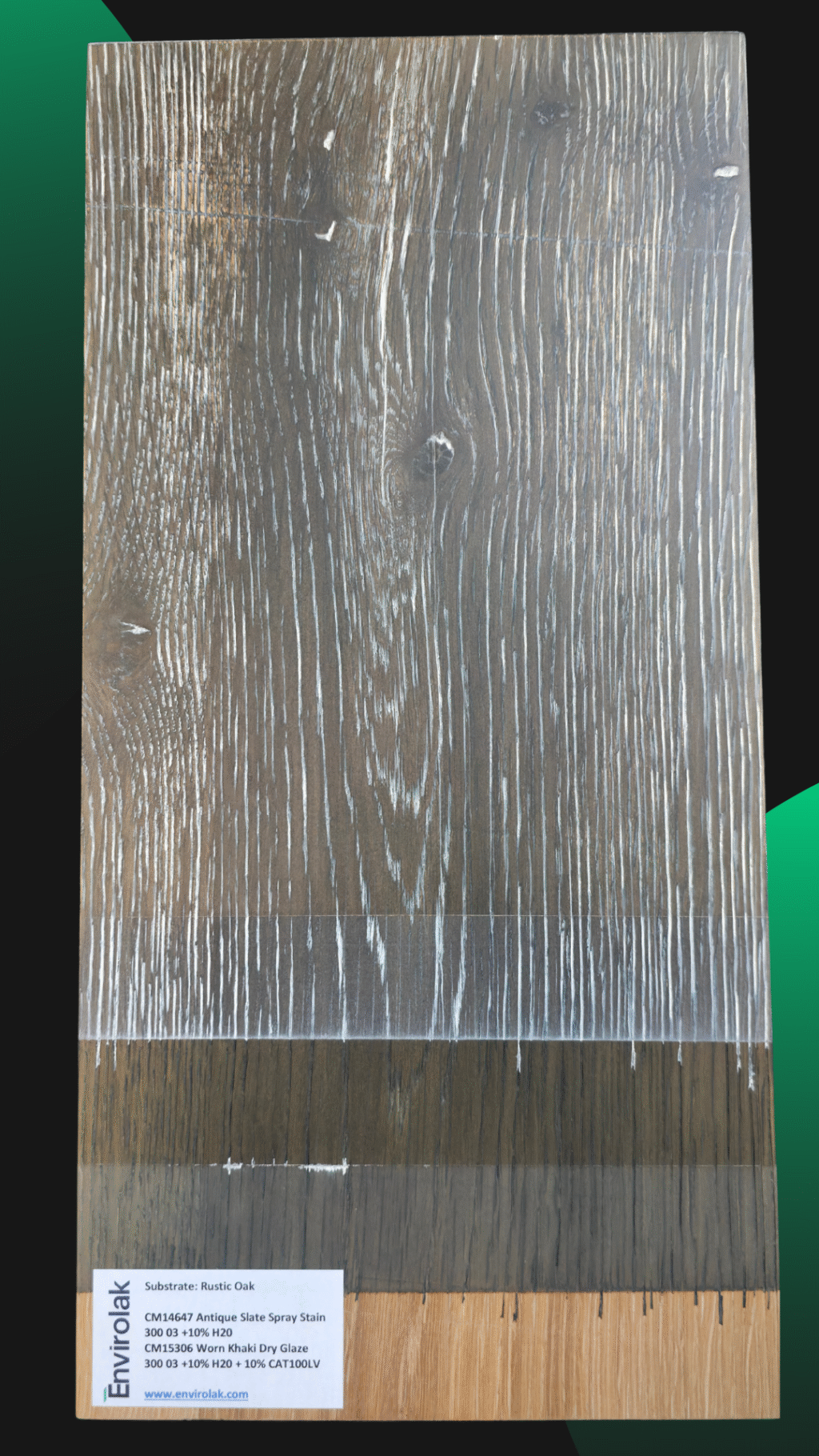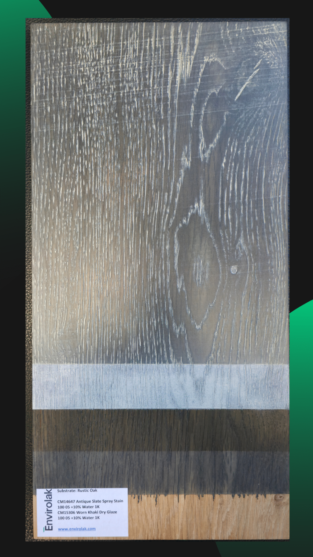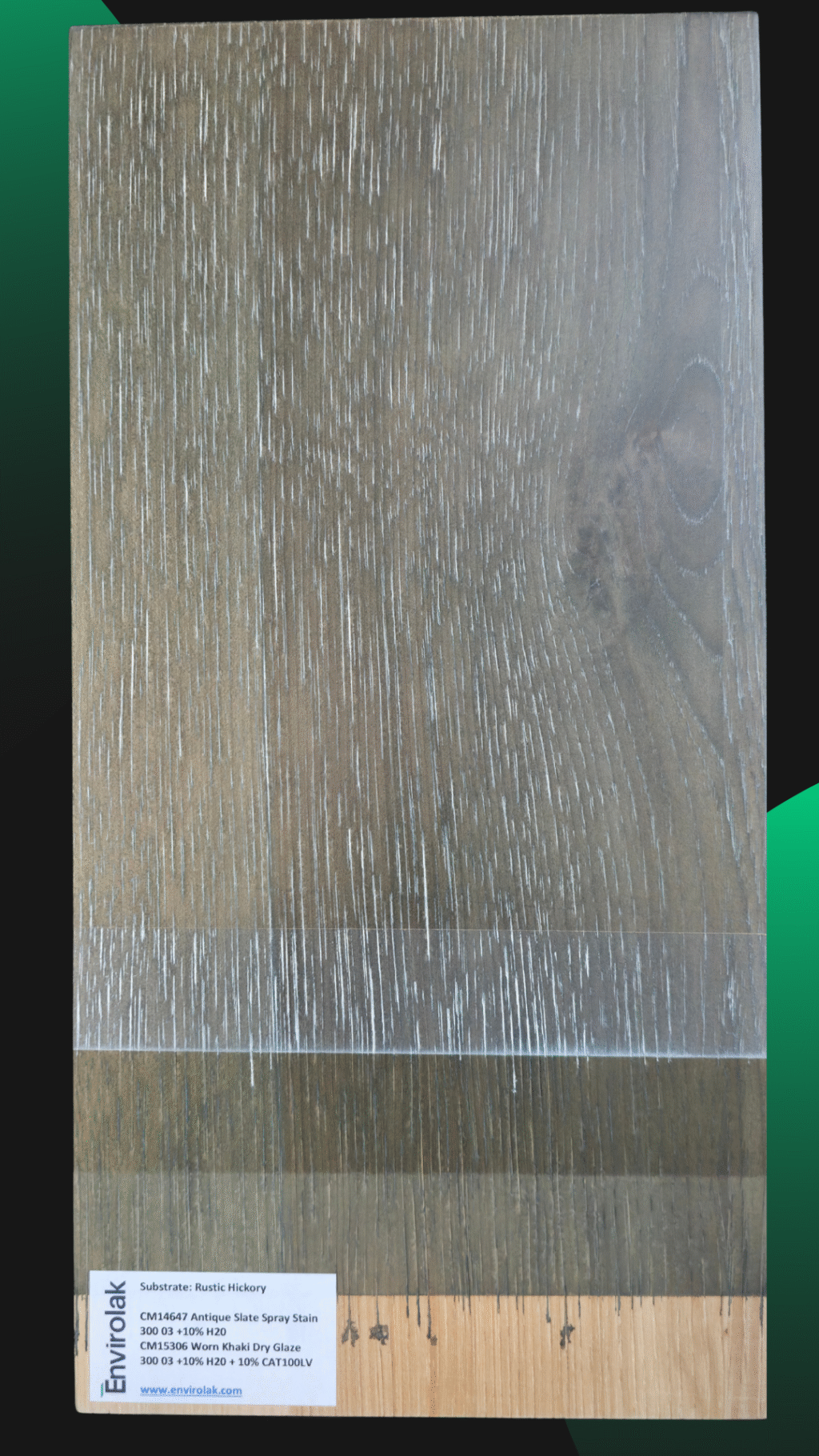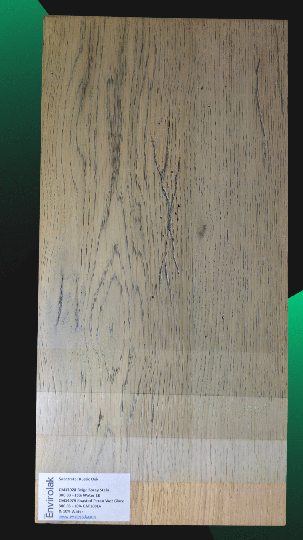 Another panel from our training center, where we explore how base tones and glazes interact to shape the final look. This process features warm undertones and gentle contrast—perfect for projects where subtlety speaks volumes. On rustic oak.